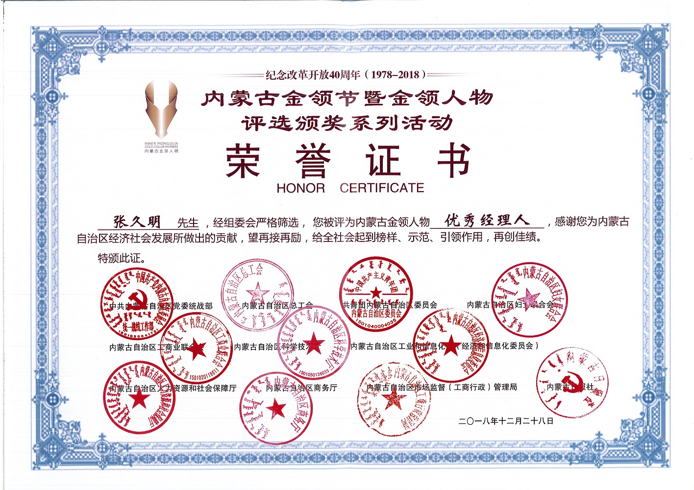 內(nèi)蒙古金領(lǐng)節(jié)暨金領(lǐng)人物評選頒獎系列活動榮譽證書